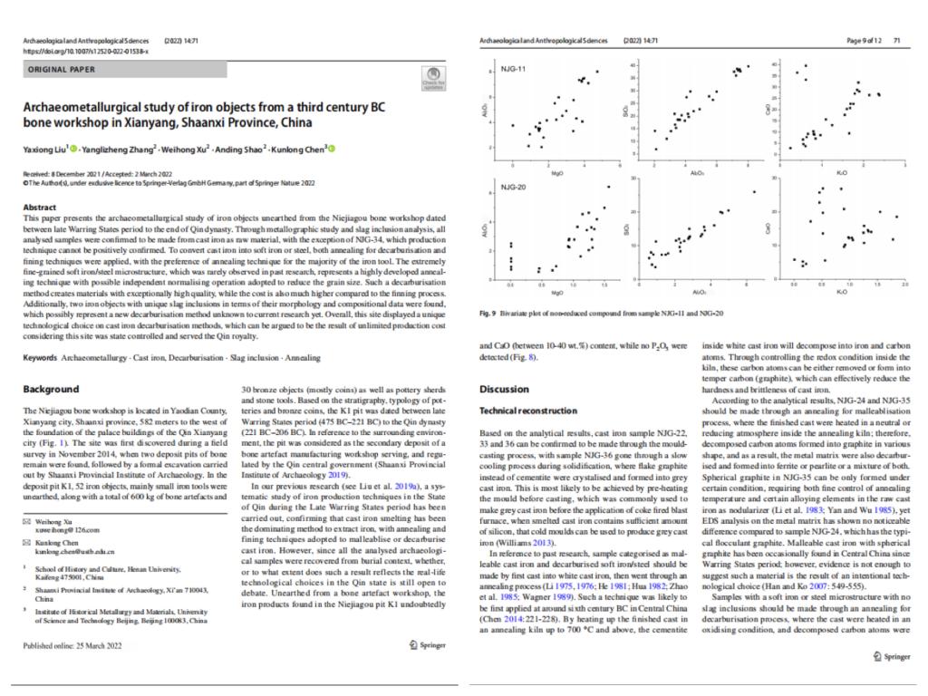近日,麻豆社 青年教师刘亚雄在国际知名期刊《考古学与人类学科学》(Archaeological and Anthropological Sciences)(SSCI一区期刊,同时被SCI和A&HCI索引收录)发表了其阶段性研究成果《陕西咸阳聂家沟骨器作坊出土铁器的科学分析》Archaeometallurgical study of iron objects from a third century BC bone workshop in Xianyang, Shaanxi Province, China
