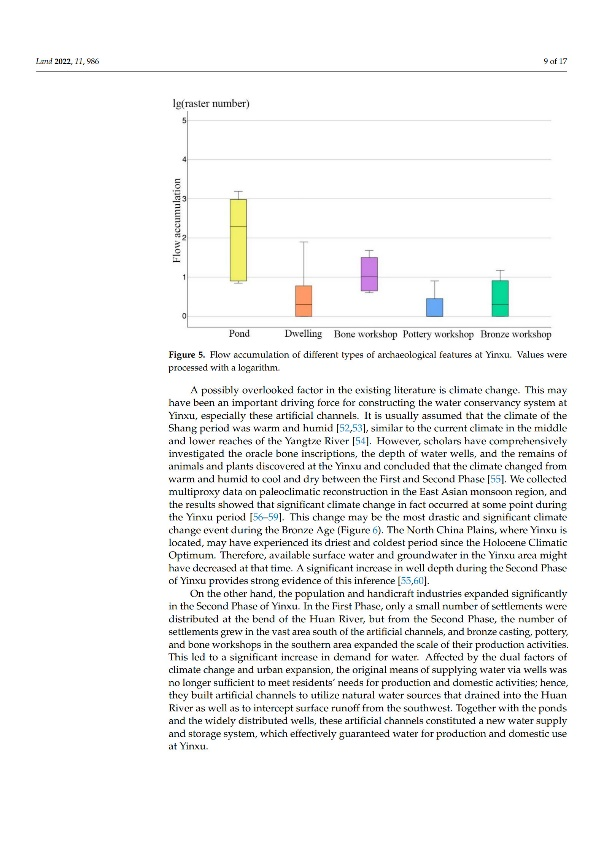 该研究通过使用基于地理信息系统(GIS)的水文分析和密度分析等方法,对殷墟遗址的水利系统和都邑空间布局开展了量化研究。分析结果显示,人工沟渠、陂池等水利设施显著改变了遗址区原有地表径流模式,从而有效实现了对都邑内水资源的重新调配。文章根据已有的石笋氧同位素、湖底碳酸盐沉积物等古气候重建数据,指出殷商都邑大型水利设施的修建是由殷墟一二期之间气候干凉化和都邑规模扩张的双重因素所导致的。同时,人工沟渠可能作为界隔线与洹河共同构筑出一片相对封闭的“核心区域”用以保护商王室的安全,从而形成了一套有别于青铜时代其他大型都邑的、以“无城墙化”为特征的防御体系。