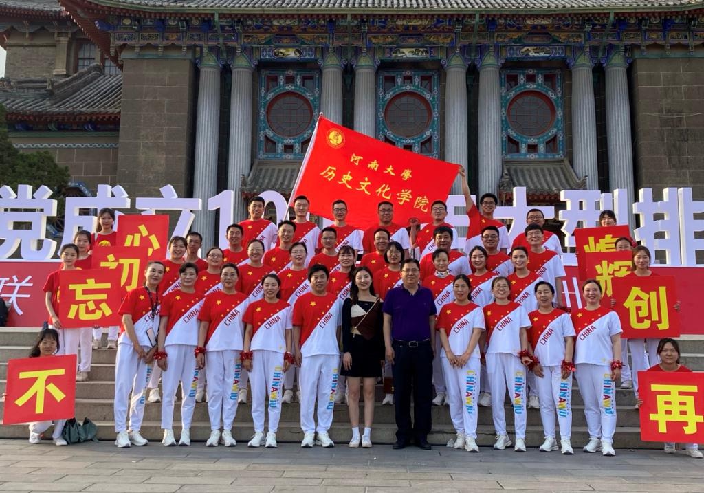 比赛开始后,学院表演方队统一着装,精神抖擞,神采奕奕,快速跑至舞台中央,随着音乐的旋律舞动起来。方阵队列变幻多端而又井然有序,整齐的步伐、灵活的身姿、洋溢的笑容展示着学院教职工的动人风采。比赛最后,学院方阵展示出众人拥簇党旗的造型,同时举出“不忘初心,再创辉煌”八个大字,彰显着学院教职工的集体承诺与坚定信仰,更是对中国共产党成立100周年的衷心祝福,以及对党的歌颂与礼赞。