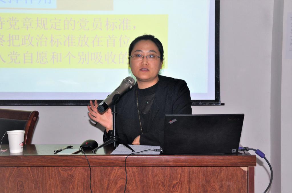 党员发展程序有着严格的规定,她首先从党员发展的十六字方针“控制总量、优化结构、提高质量、发挥作用”开始,指出党员发展要严格遵守党章规定的标准,始终把政治标准放在首位,坚持入党自愿和个别吸收的原则。随后就组织发展流程进行展开,从积极分子到预备党员、从预备党员到正式党员期间所要注意的事项为同学们作了详细说明。最后她强调,党章要熟记,其中的内容编排顺序有其深意,不能恣意颠倒。