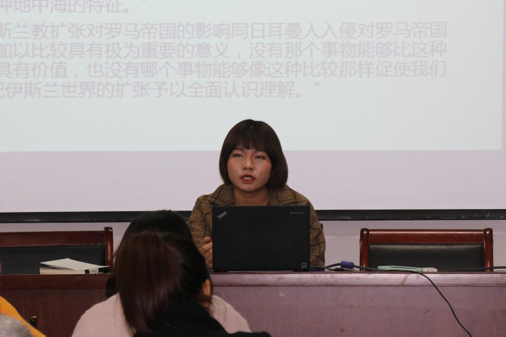 杨琦帆首先介绍了《穆罕穆德与查理曼》一书的章节概述,指出这本书的成书原因是对传统解释解构与重建,并梳理出皮朗的几个经典论述。针对其中“没有穆罕穆德,就没有查理曼”这个论述,她这样解释查理曼和穆罕穆德之间的联系:“穆罕穆德成就了查理曼”并列举三点原因进行论证。随后,杨琦帆在阅读这本书后的反思和启示,她立足历史例证,以设问和回答的形式与大家探讨了“皮朗命题”是否正确、476年这个节点是否重要、欧洲文明在何时形成历史上是否存在一体化的欧洲等七个问题。在对“‘皮朗命题’是否正确”这一问题的探讨中,她深刻分析西方历史学界经济、考古、马克思主义等不同领域的学者对皮朗命题的看法,并得出了西方史学界已在很大程度上修正“皮朗命题”的结论。最后,结合这本书带来的启发,杨琦帆以一种新的视角看当今的欧洲难民潮问题与伊斯兰教问等困扰欧洲政局的热点问题。她认为适应能力对于个人和民族的生存来说,是至关重要的,对于处在社会转型之中的中国如制定政策极具借鉴意义。同时也要警惕中国在启动内需和转型驱动时可能带来的负面影响。