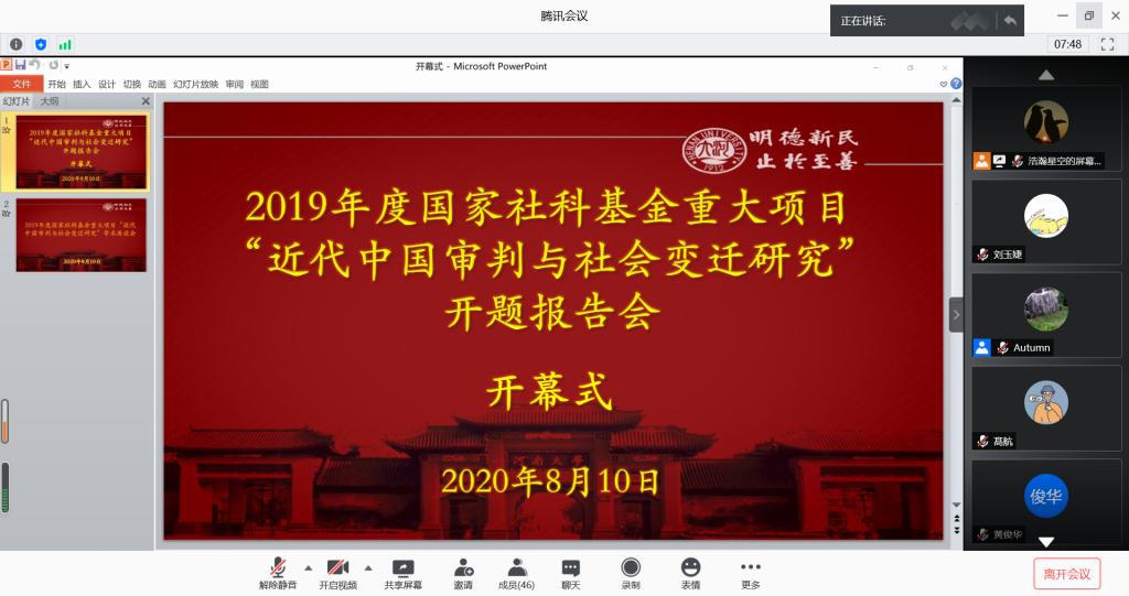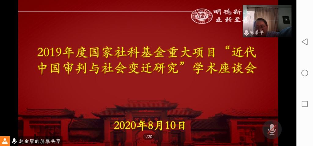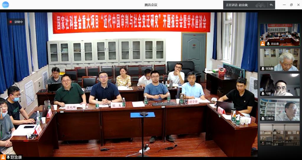 近代中国研究所承办的2019年度国家社科基金重大项目 “近代中国审判与社会变迁研究” 开题报告会暨学术座谈会以线上形式举行。中国社会科学院学部委员张海鹏研究员,华中师范大学近代中国研究所所长马敏教授,中国社科院世界历史研究所长汪朝光研究员,南京大学陈谦平教授,北京师范大学李帆教授、朱汉国教授,南开大学王先明教授、浙江大学陈红民教授,复旦大学章清教授,作为专家评议专家成员出席开题会。麻豆社