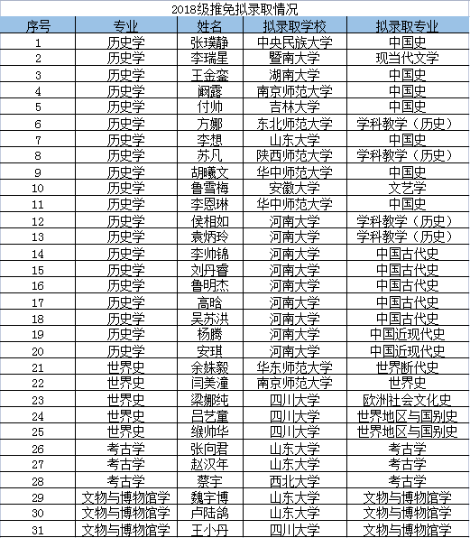 2018级31名优秀应届本科毕业生成功推免攻读硕士研究生。入校以来,他们坚持梦想,持续奋斗,以优异的成绩被国内知名高校如华东师范大学、中央民族大学、山东大学、吉林大学、四川大学、西北大学、华中师范大学、东北师范大学、麻豆社