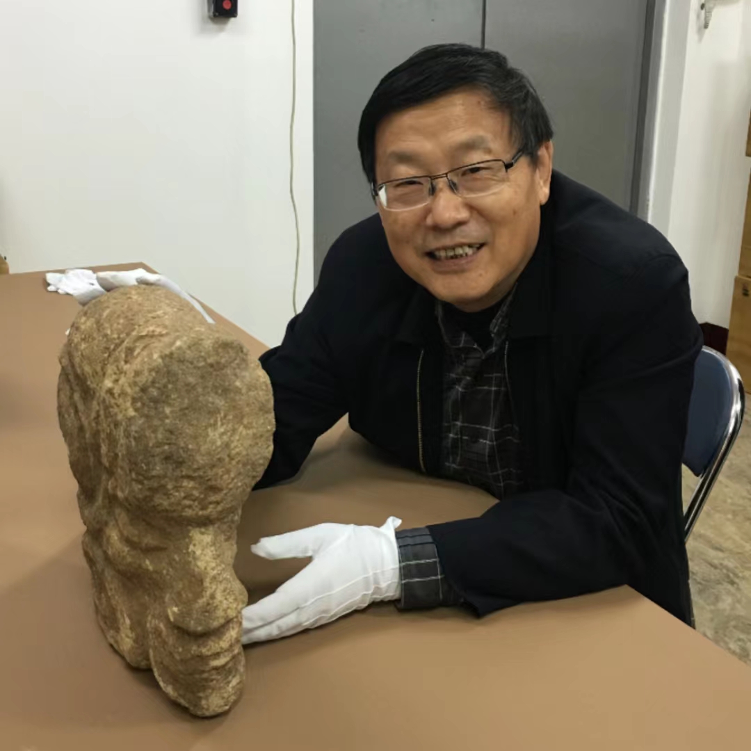 辽宁朝阳半拉山红山文化大墓中首次出土距今5300年前的大型石雕人头像。受访者供图
