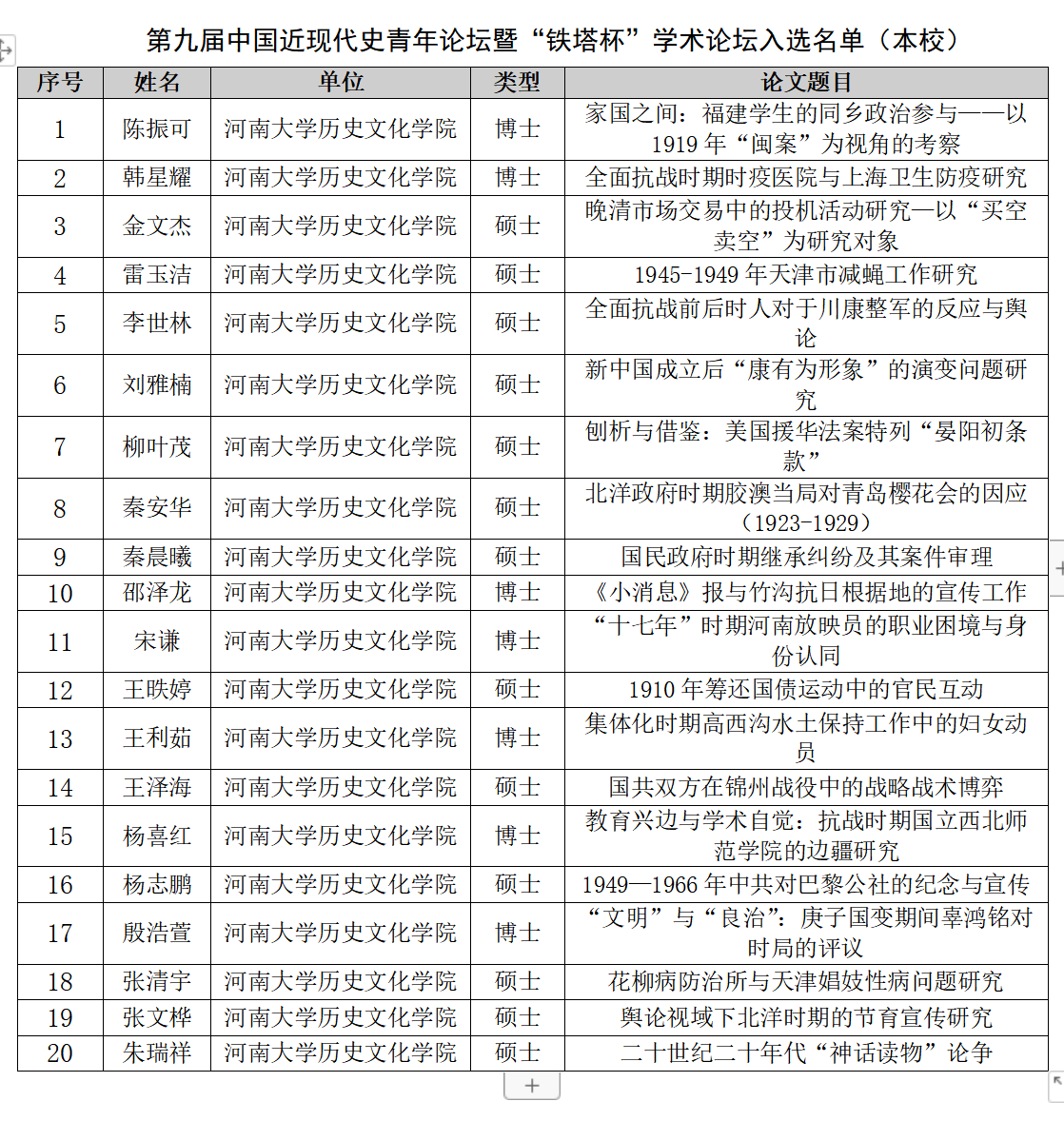 及《史学月刊》编辑部相关专家审阅、评选,最终遴选出46篇论文参会。限于会议规模,还有较多优秀论文无法入选,甚是遗憾,谨此对广大师生的支持与厚爱表示感谢。