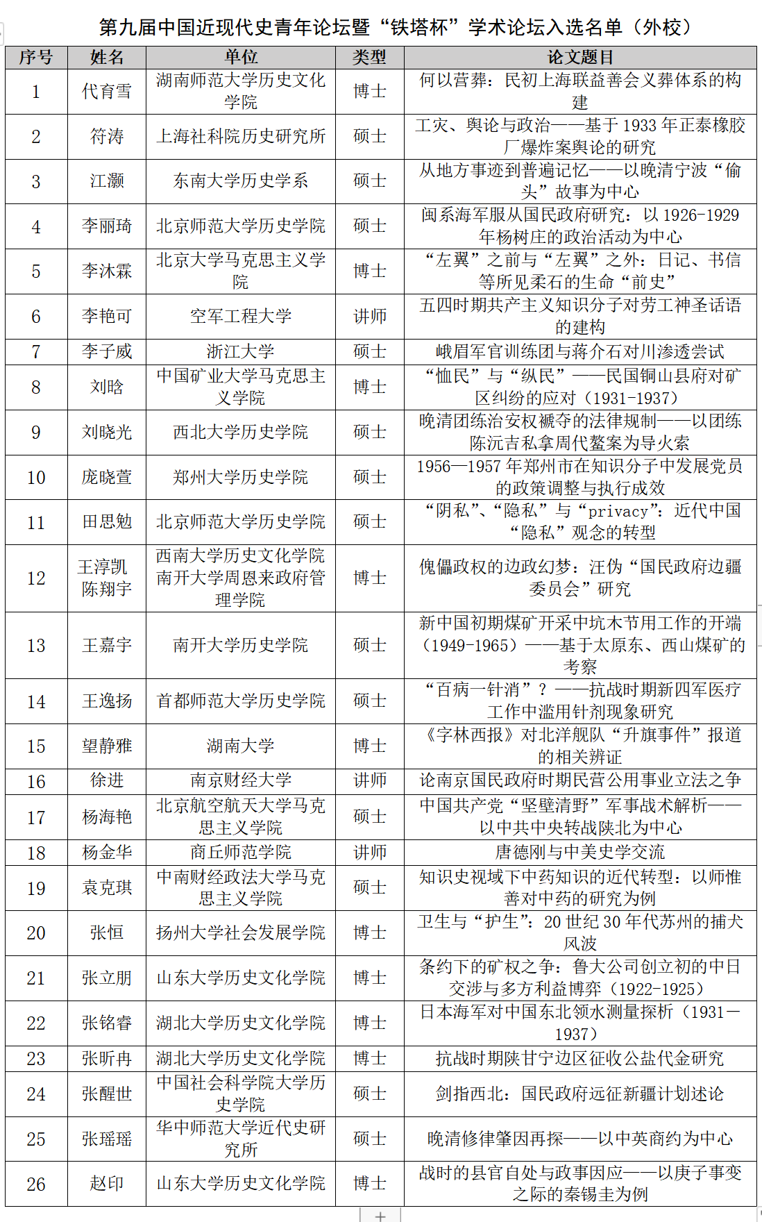 再次感谢广大师生对第九届中国近现代史青年论坛暨“铁塔杯”学术论坛的大力支持!