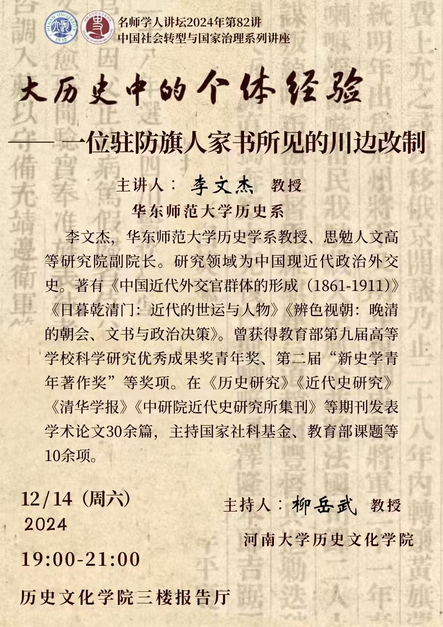【讲座预告】李文杰:大历史中的个体经验——一位驻防旗人家书所见的川边改制