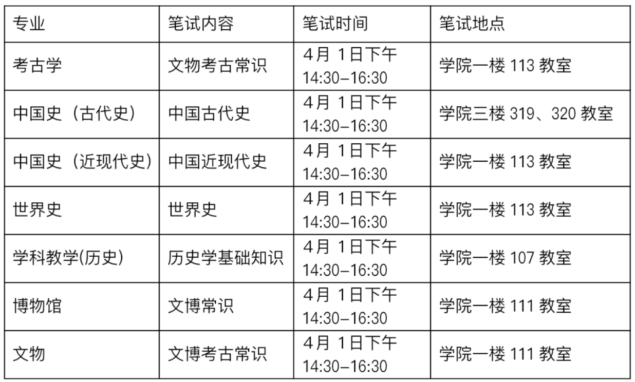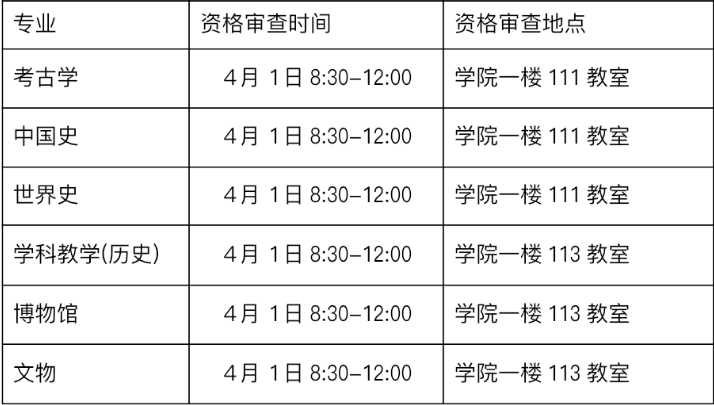考古学、中国史、世界史学术学位研究生和学科教学(历史)、博物馆、文物专业学位研究生复试内容包括外语测试、专业知识测试、综合能力面试。各考试科目单独打分,满分均为100分,计入复试总成绩,在复试成绩中所占权重分别为10%、45%、45%。以上三个科目中,任意一科成绩低于60分者,不予录取。