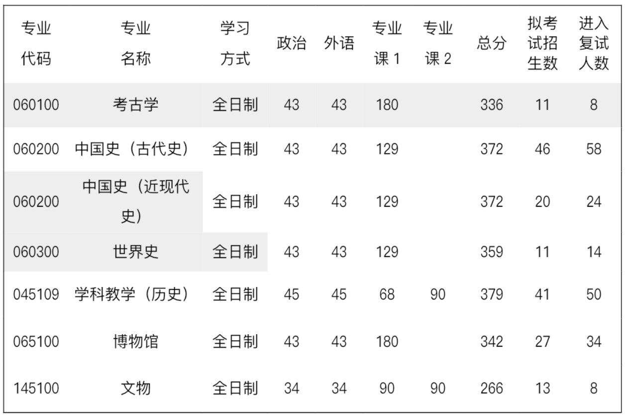 招生具体情况,划定2025年考古学、中国史、世界史学术型硕士研究生以及学科教学(历史)、文物、博物馆专业型硕士研究生的复试分数线,具体如下表所示。