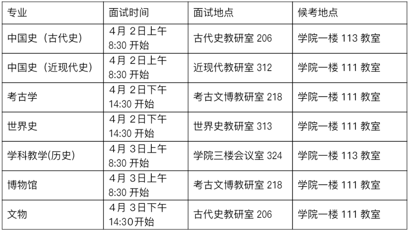 3.综合能力面试:采取面试的方式进行,主要对考生的知识结构和综合能力、思想品德以及心理素质等方面进行测试。满分为100分,计入复试总成绩,成绩低于60分者,不予录取。各专业具体面试时间安排如下: