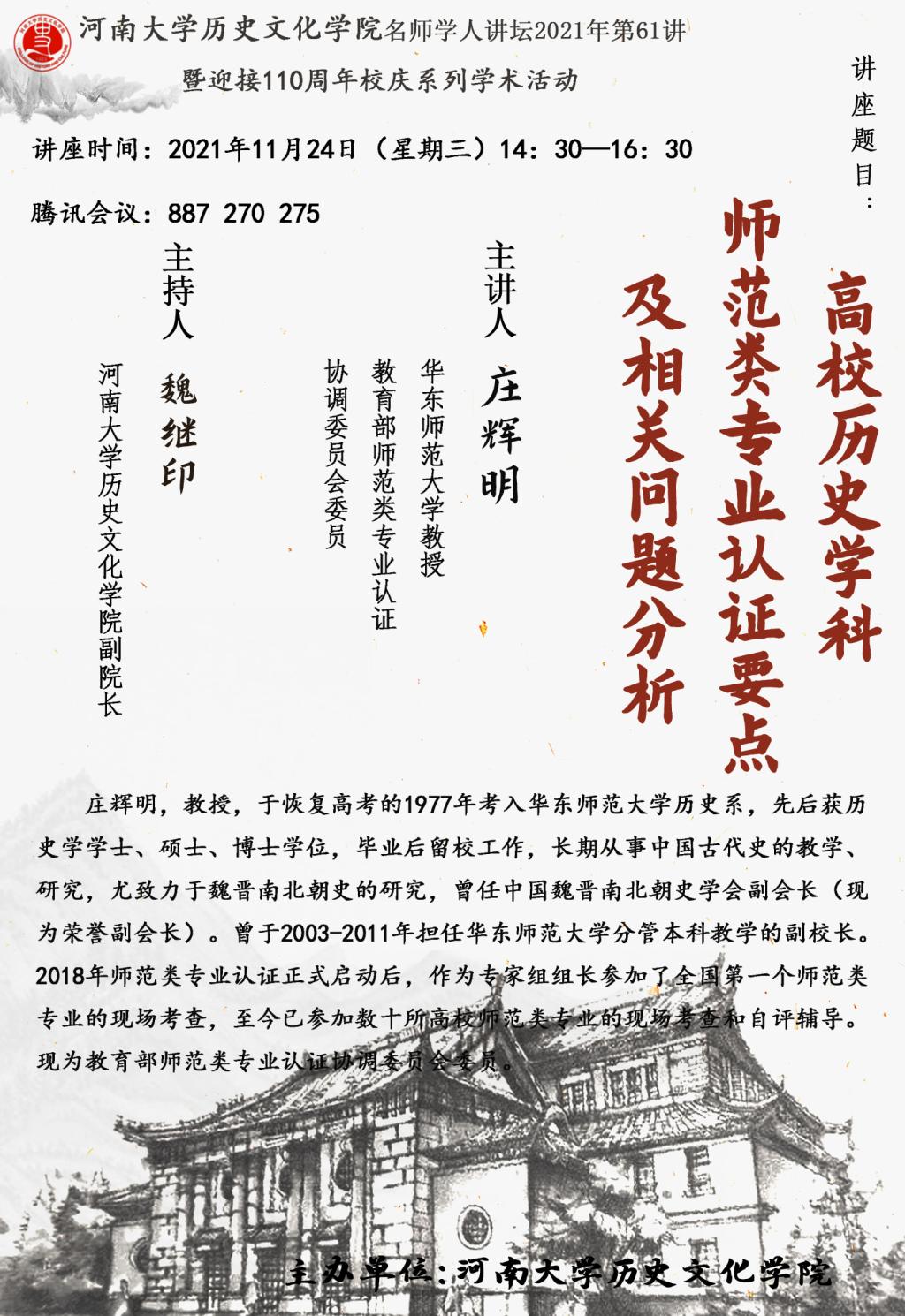 【讲座通知】庄辉明:高校历史学科师范类专业认证要点及相关问题分析