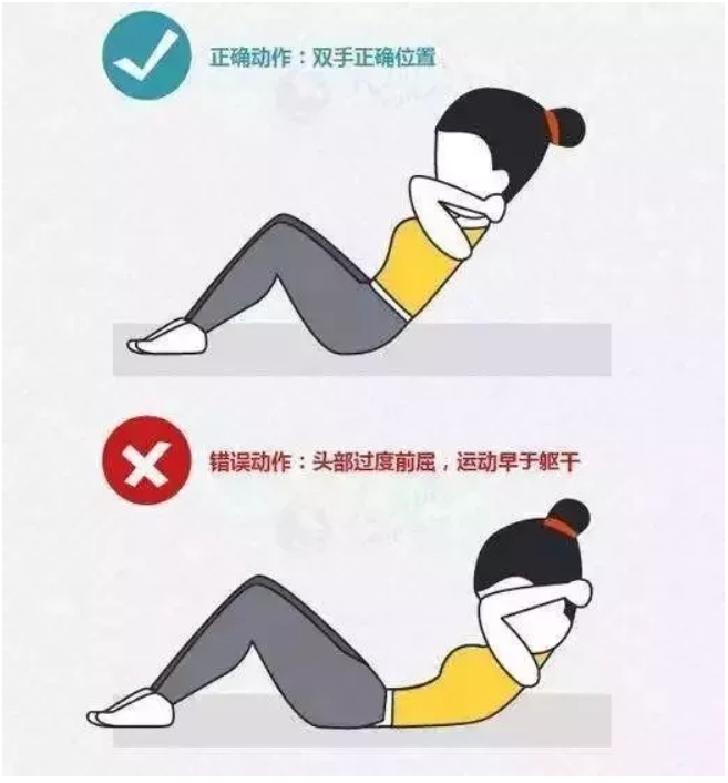 身体平躺于垫子上,两腿张开与肩同宽,屈膝成90度左右,脚部平放在地上。两手放在颈部或者耳际,腹部收缩,腰腹部用力使上半身离地,幅度不要过小。然后肩胛骨轻触到床面,之后马上重复下一个动作,继续做仰卧起坐。(注意:千万不要把双手的手指交叉放于头后面,以免用力时拉伤颈部的肌肉)