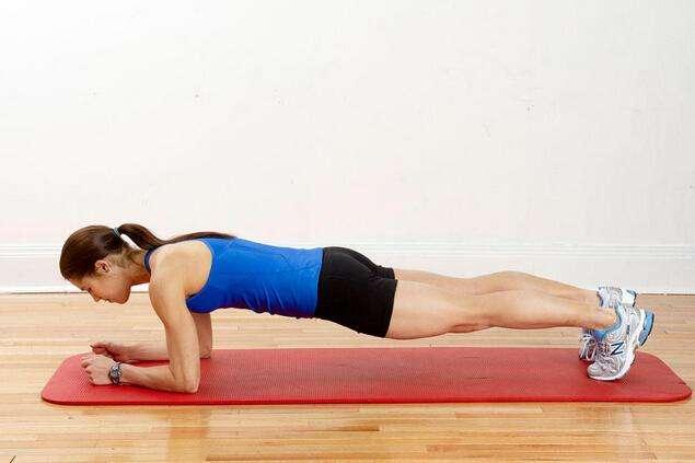 双手支撑身体,双臂垂直于地面,两腿向身体后方伸展,依靠双手和两个脚的脚尖保持平衡,保持头、脖子、后背、臀部以及双腿在一条直线上动作重点:全身挺直,平起平落。