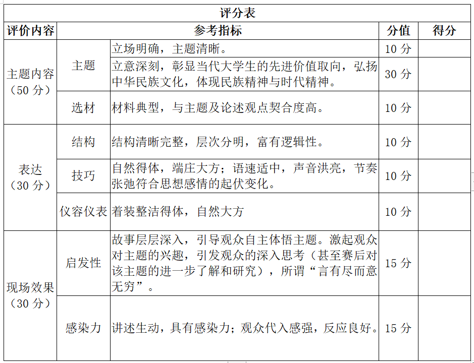 5.各班应于4月17日之前完成初赛选拔,并18日中午14:00将各班评分表、推选结果纸质版送至麻豆社