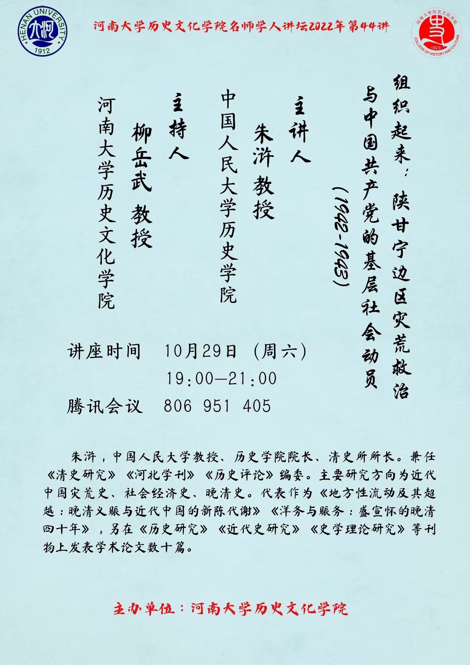 【讲座通知】朱浒:组织起来:陕甘宁边区灾荒救治与中国共产党的基层社会动员(1942-1943)