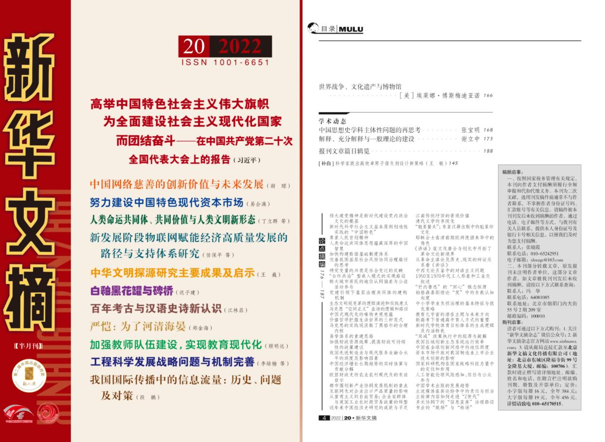 特聘教授王巍的文章《中华文明探源研究主要成果及启示》和张宝明教授的文章《中国思想史学科主体性问题的再思考》,被《新华文摘》2022年第20期全文转载。