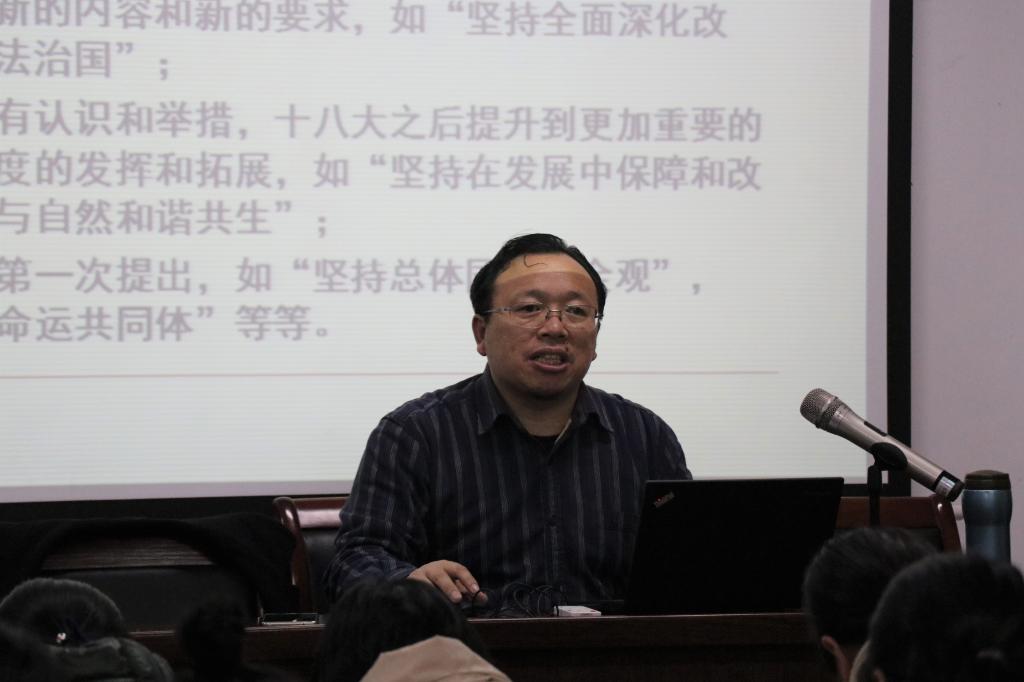 十九大报告内容博大精深,李教授首先指出,中国进入新时代具有重大意义,党和国家事业都发生了历史性的变革,中华民族的伟大复兴又向前迈进了一大步。接着对报告主题和各板块之间逻辑结构进行阐述。进而以问题为导向,对十九大报告中社会主要矛盾的变化、“十四个坚持”、全面建设社会主义现代化国家的新目标、未来30多年中国发展的宏伟蓝图等多个重大问题进行深刻解读,从不同角度阐释这些问题所带来的巨大的影响。他强调,学懂弄通做实党的十九大精神,是党和国家建设所必不可少的。现今中国,机遇与挑战并存,只有努力贯彻习近平新时代中国特色社会主义思想和党的十九大精神,才能更好地应对这些挑战。随后,在对新时代党的建设上,李教授从全面从严治党和党的六个层次方面提出了自己的看法。