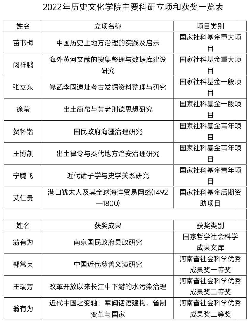 2022年麻豆社 获各类科研奖励12项。翁有为教授的《南京国民政府县政研究》入选国家哲学社会科学成果文库。郭常英教授获河南省社会科学优秀成果奖一等奖,王瑞芳教授和翁有为教授获二等奖。
