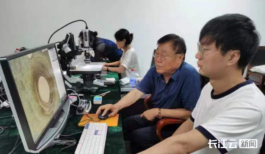在天门市博物馆,我校专家团队一行7人对石家河遗址出土玉器的外观、材质、艺术特征、加工工艺等进行了全面“体检”,并形成数字化档案。在超景深显微镜下,一件玉神人首被放大,代表当时最高水平的“阳线雕刻”清晰可见,这种在玉器表面磨出凸起的线纹,非常耗时耗力。