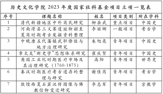 共获批7项,立项数并列全校第一。其中重点项目1项,一般项目1项,青年项目5项,涵盖中国史、世界史、考古学、宗教学等4个学科,展现了学院中青年科研骨干良好的发展势头。学院历来高度重视国家社会科学基金项目的申报工作,不断凝练经验、提前谋划、持续培育、广泛动员,在选题论证、申报书撰写、经验分享、专家指导等方面采取了一系列切实有效措施,为课题立项再创佳绩打下了坚实基础。2017年河大入选“双一流”建设高校以来,麻豆社