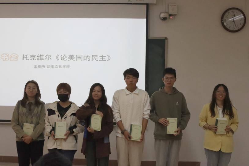 本科2021级、2022级、2023级明德计划世界史实验班在综合楼109教室举行读书交流会。本次会议围绕托克维尔的《论美国民主》一书展开汇报交流。读书会由杨磊老师主持,梅祖蓉、陈超、李泽源、刘洪浩、王亚萍等老师参与并进行点评。