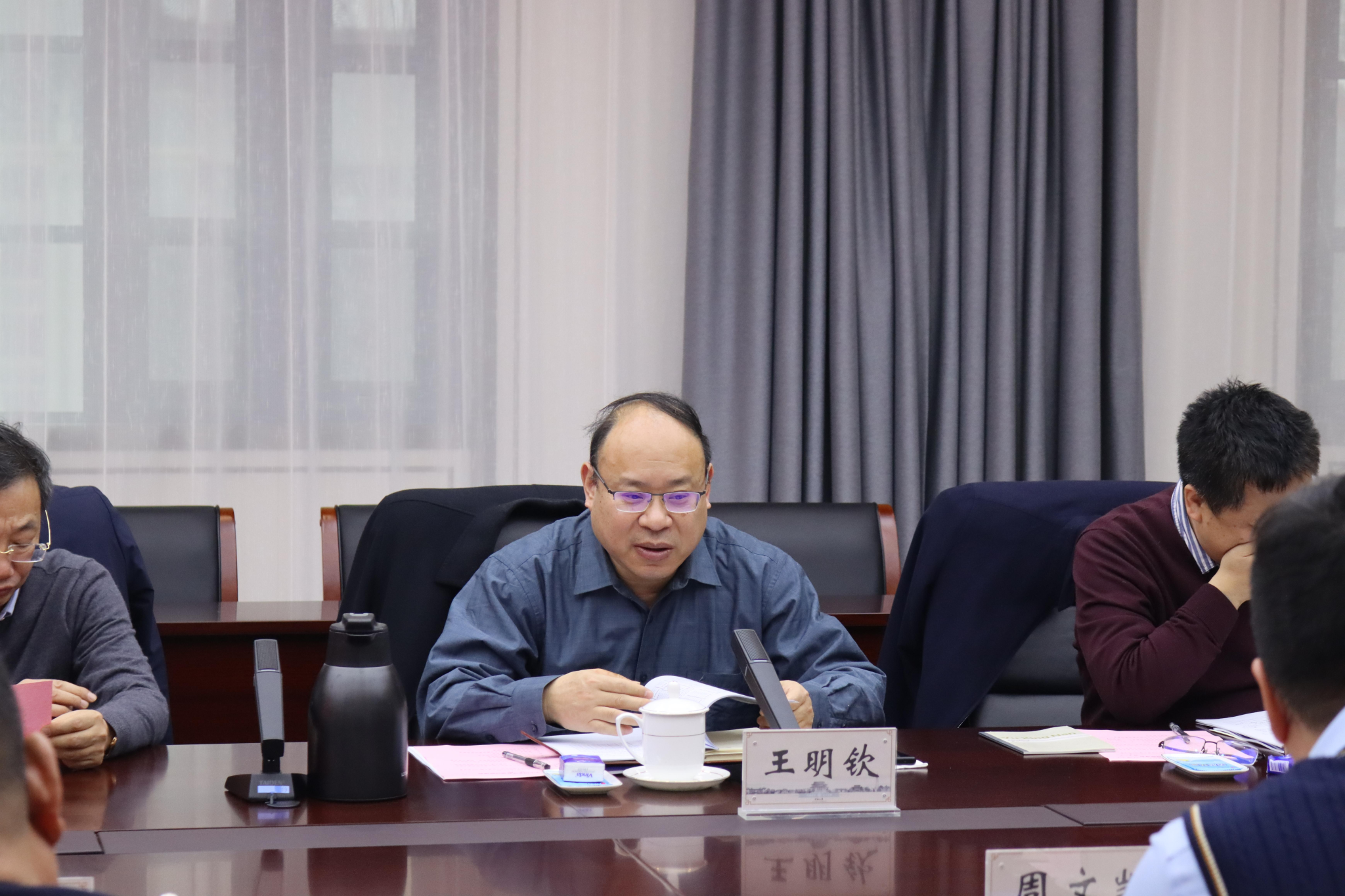 领导班子成员周文凯、李竞艳、胡浩、陈升远、闵祥鹏分别结合各自分管工作,从师德师风建设、宣传文化建设、研究生教育、导师队伍建设、高水平科研成果产出、科研平台建设、博士后管理、师资队伍规划、资源盘活配置、社会服务、本科生教学、高水平教学成果培育等具体方面汇报了工作开展情况及未来计划。