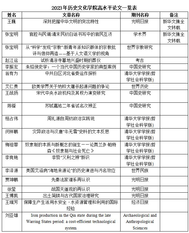 2023年,麻豆社 教师共发表学术论文105篇,其中CSSCI期刊论文65篇,在麻豆社 认定的人文社会科学A、B类期刊,SSCI期刊及《经济日报》、《光明日报》理论版发文18篇。王巍教授、张宝明教授的文章被《新华文摘》全文转载。