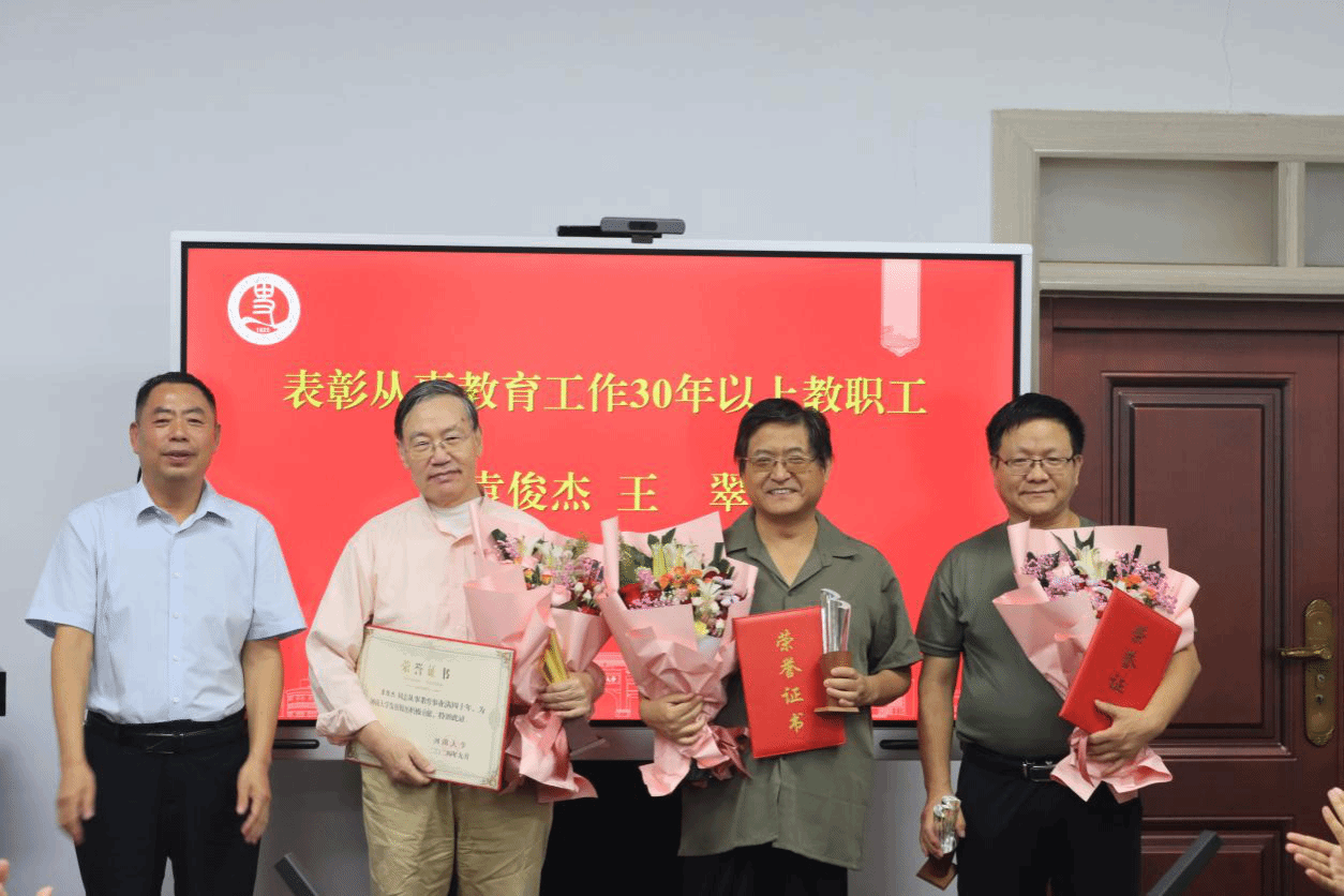 关于表彰从事教育工作30年以上教职工的决定》,并为学院新增从教满40年的袁俊杰、王翠和新增从教满30年的张立东、邱胜利老师颁发证书和奖杯。