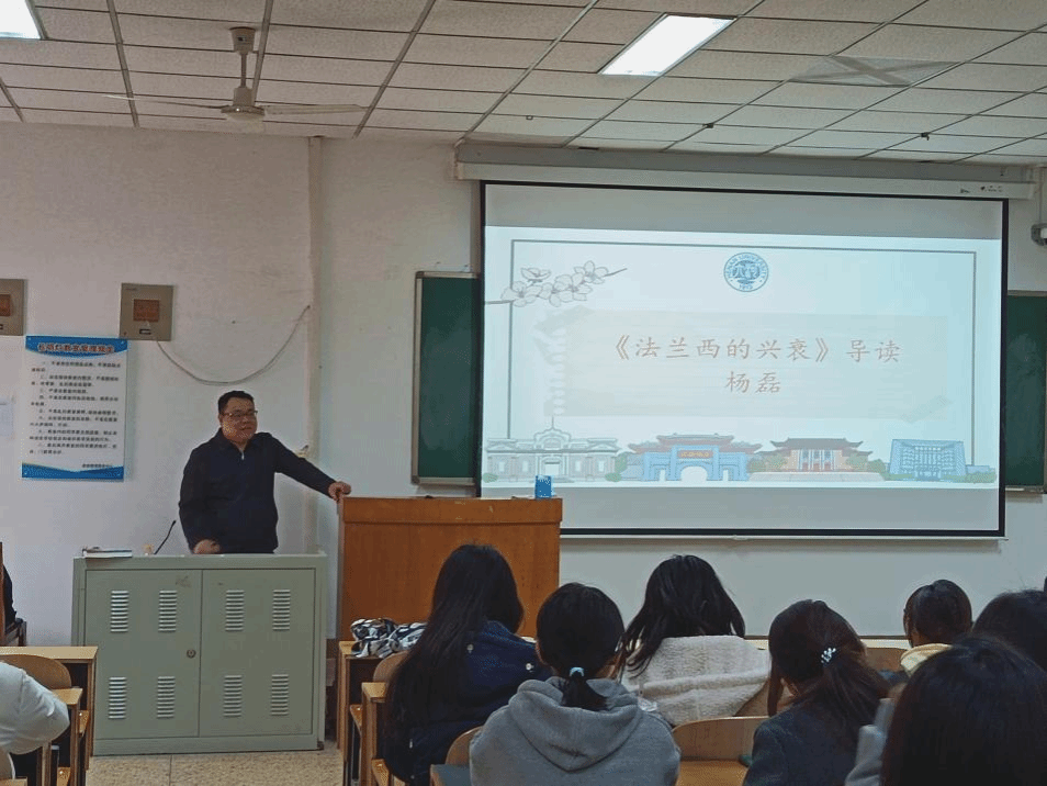 世界史教研室、区域与国别研究院主办的“明德计划”世界史实验班读书分享会在综合楼109教室成功举行。本次读书会以吕一民教授《法兰西的兴衰:从立国到当今》为研读核心,由世界史教研室杨磊老师领读,王亚萍老师主持,2021级、2022级、2023级实验班全体同学参与。