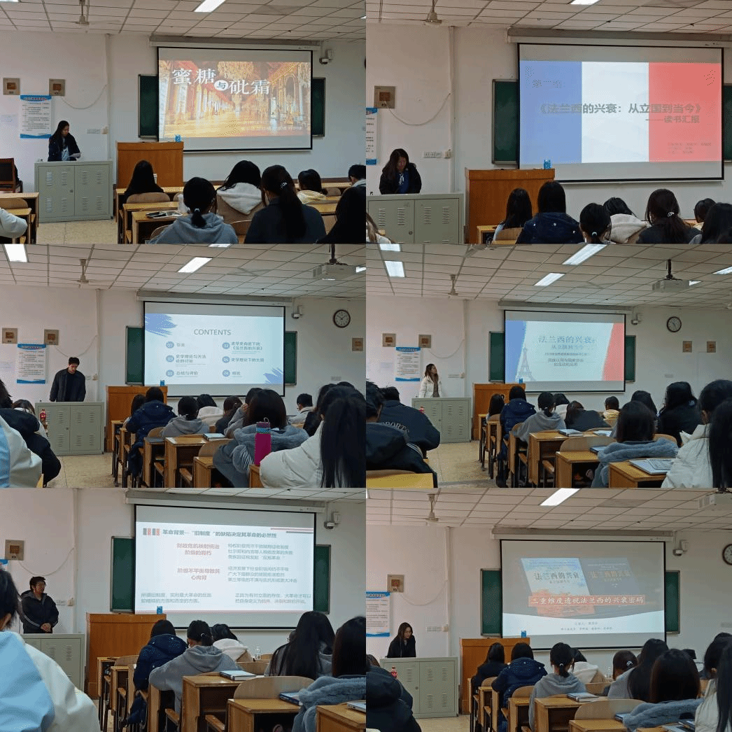 随后,六组同学依次进行主题汇报。第一组童宇思同学以“蜜糖与砒霜”为线索,通过历史上的典型事件阐释法国辉煌与衰落的辩证关系,提炼出“国家决策需平衡理想与现实”的当代启示;第二组姚怡帆同学则从地理、制度、文化等角度分析法国大国地位变迁的动因;第三组李志成同学强调了本书将传统历史叙事与现代史学理论融合的写作特点及其对史学研究方法的启示;第四组宋舒一同学结合法国民族意识的发展历程与近代民族建构案例,聚焦“民族认同与国家命运的互动与反思”;第五组谢兴祥同学以“拿破仑与大革命”为主题,剖析法国大革命的彻底性与拿破仑对启蒙思想的继承;第六组由蒋家乐同学汇报,他们创新性地从地缘政治、公众心理和戴高乐主义三重维度透视法兰西兴衰密码,以结构性分析赢得师生好评。