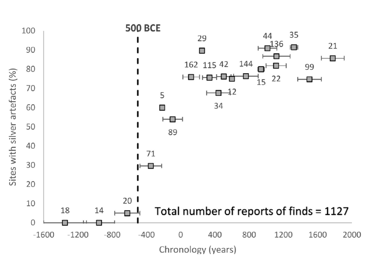 出土有银器的考古遗址百分比随时间变化的趋势