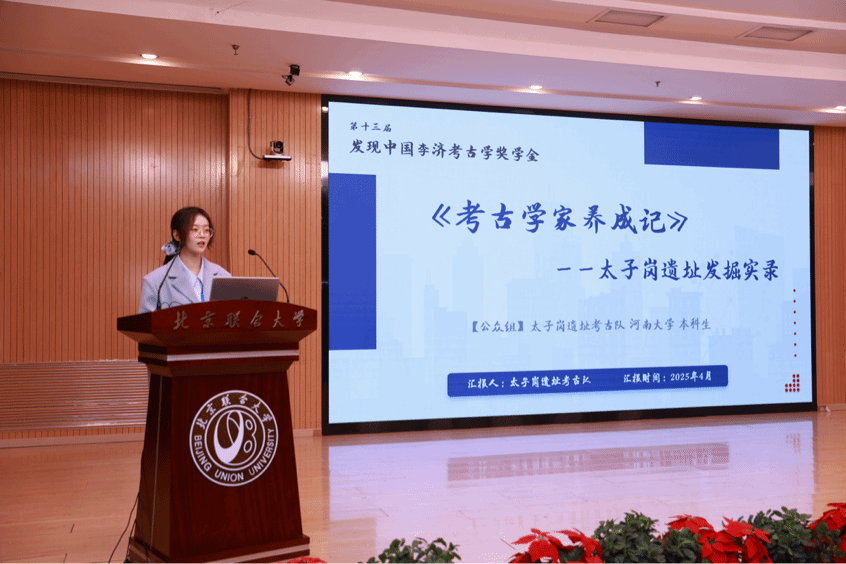 颁奖仪式上,北京联合大学副校长李雪华宣读了本届李济考古奖学金入围名单和获奖名单,中国人民大学韩建业教授、首都师范大学袁广阔教授、北京联合大学雷兴山教授等颁奖嘉宾为获奖学生颁发奖状、奖杯。来自学院的太子岗遗址考古队凭借“《考古学家养成记》——太子岗遗址发掘实录”系列视频荣获公众组奖。