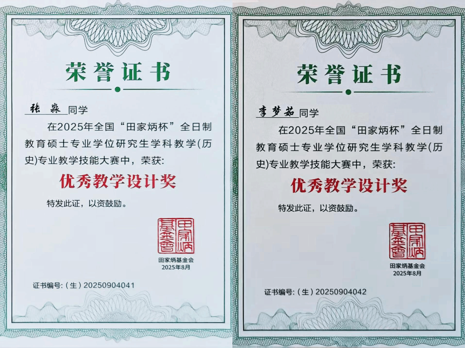 2023级与2024级学科教学(历史)专业硕士研究生张淼、李梦茹分别斩获一等奖及“优秀教学设计奖”、三等奖及“优秀教学设计奖”,指导教师黄俊华荣获“优秀指导教师奖”。