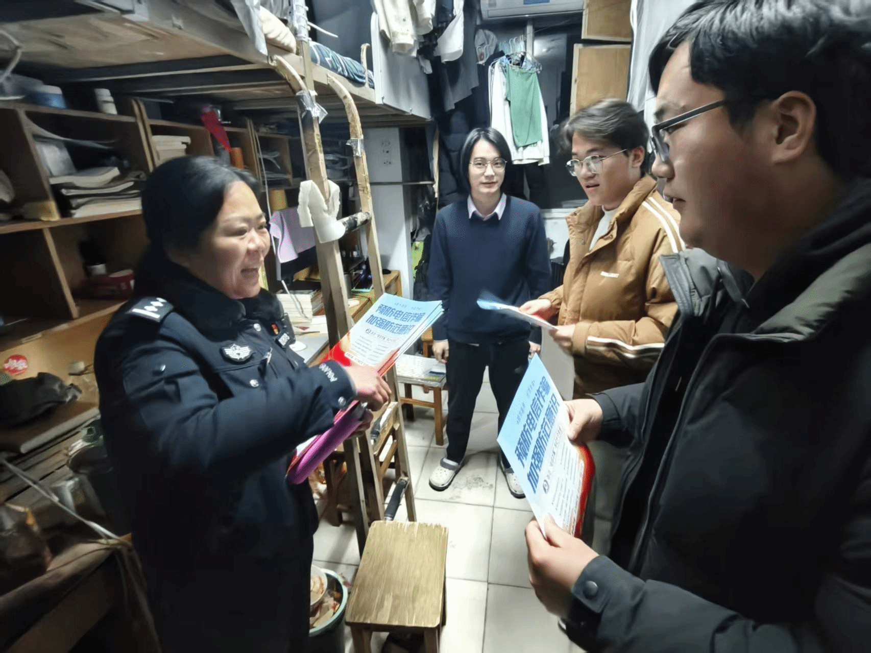 针对学生群体中易发的刷单返利、兼职诈骗以及寒假返乡前多发的冒充客服诈骗等骗局,周文凯与林芷羽陪同两名宣传员深入学生宿舍,开展精准防诈宣传活动。他们采取“案例与理论结合”的方式,以通俗易懂的语言剖析常见诈骗手法,帮助同学们直观认识电信诈骗的隐蔽性与危害性。