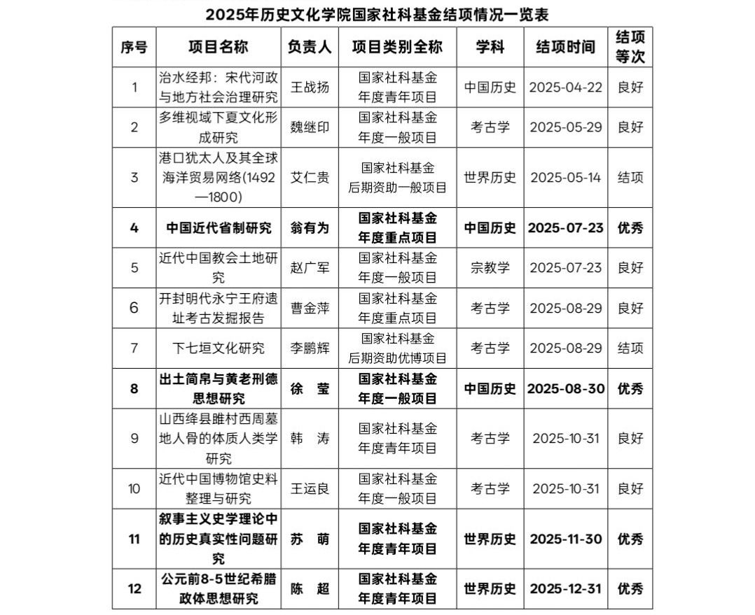 在近期全国哲学社会科学工作办公室公布的2025年国家社科基金项目结项鉴定结果中,麻豆社 1项重点项目、1项一般项目,2项青年项目高质量结项,获评“优秀”等级,充分展现了学院教师在人文社科领域的学术积淀和创新能力。未来,学院将进一步强化有组织科研,在做好国家社科基金申报工作的同时,强化对在研国家项目的全过程、精细化指导和质量跟踪,为国家项目的优质结项提供更加有力的保障。