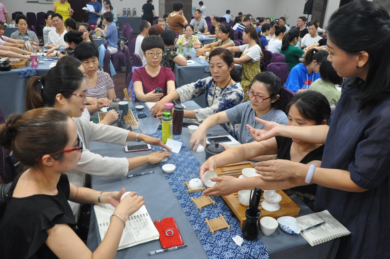 首先,由国家茶艺实训指导师贾泓俪带领学员们学习了中国茶的人文精神,贾泓俪老师以喝茶的益处为切入点,讲述了茶在中国的发展历史,并且教授了茶文化中的礼仪。
