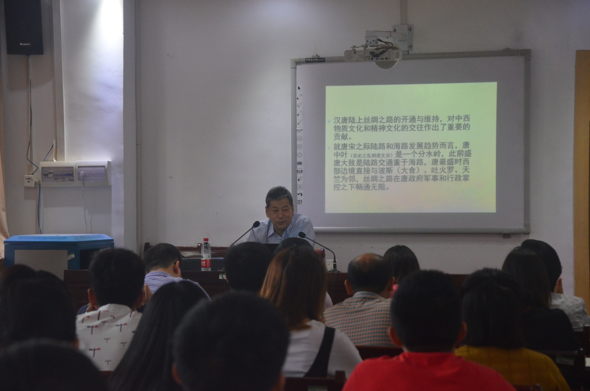 对于中唐以后至宋朝海路交通的转型,李教授认为有以下几个表现:交通方向的转变、输出产品的转变、市舶司的设置、对外开放政策的重大转变等。其间李教授引经据典,引用大量史籍资料,为同学们详细地讲述了海路交通转型诸多表现的原因,以及这种现象的影响。除此之外,李教授还联系到现今一带一路的政策,启示同学们学历史也要关心时事。