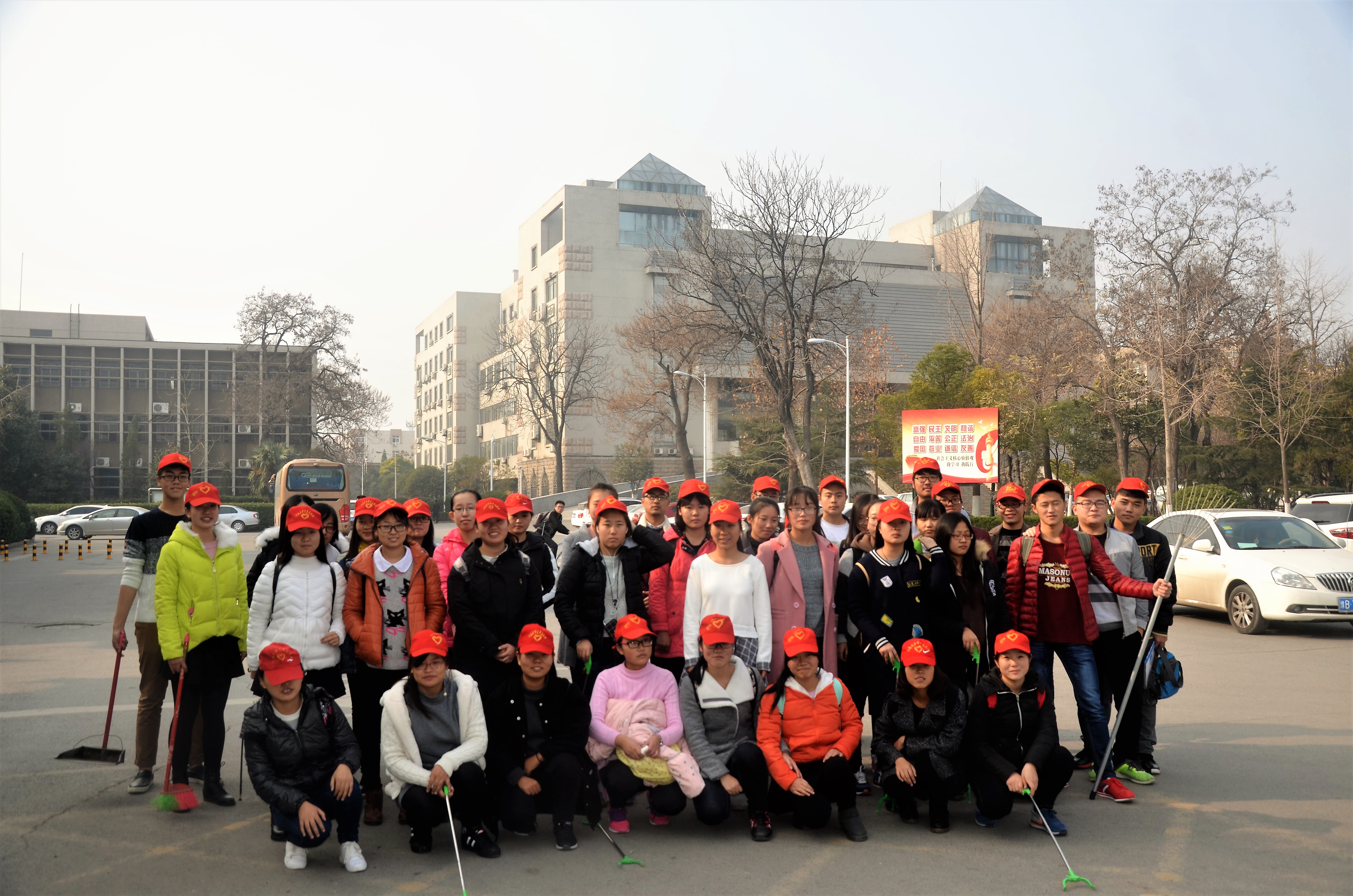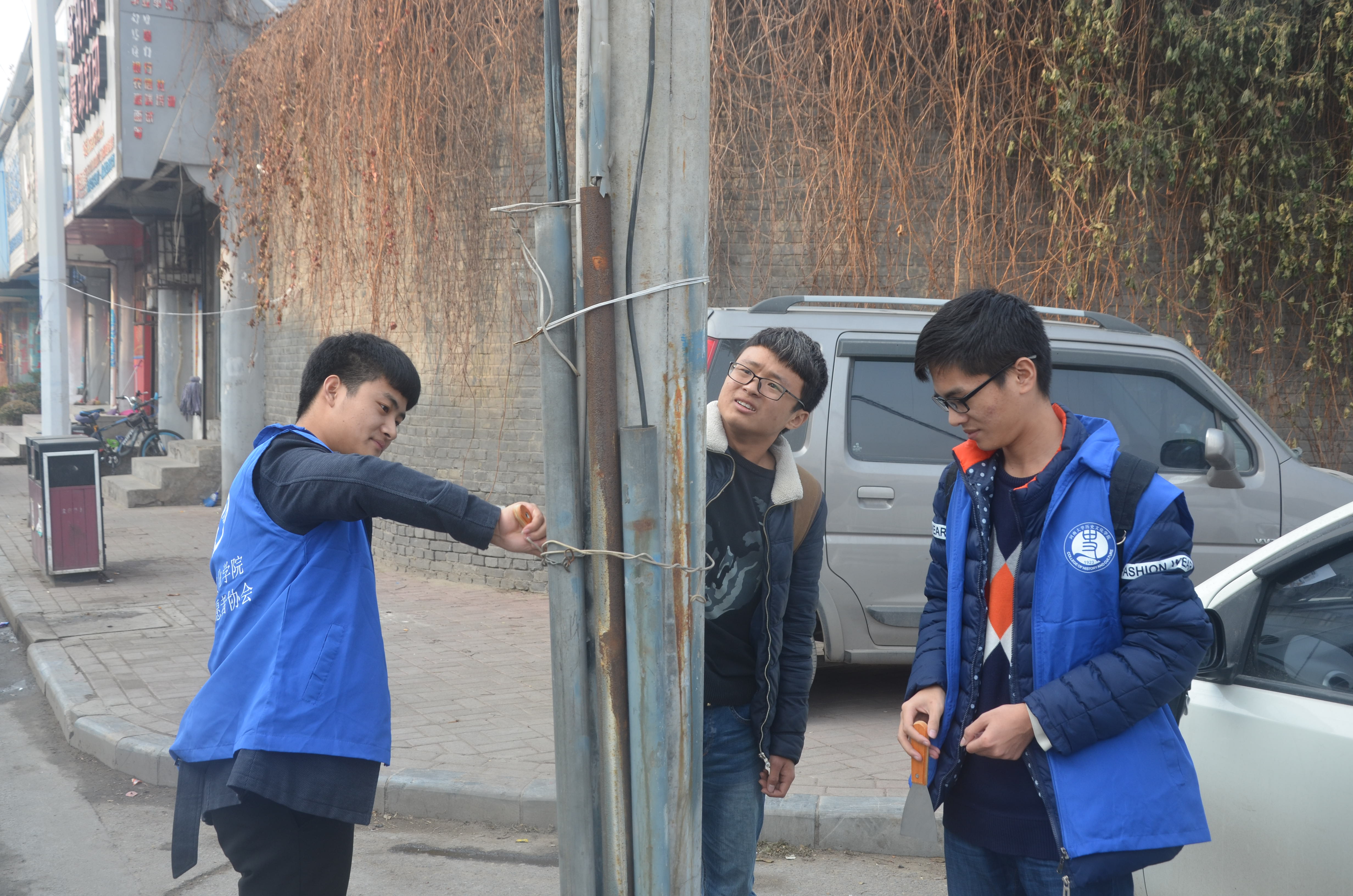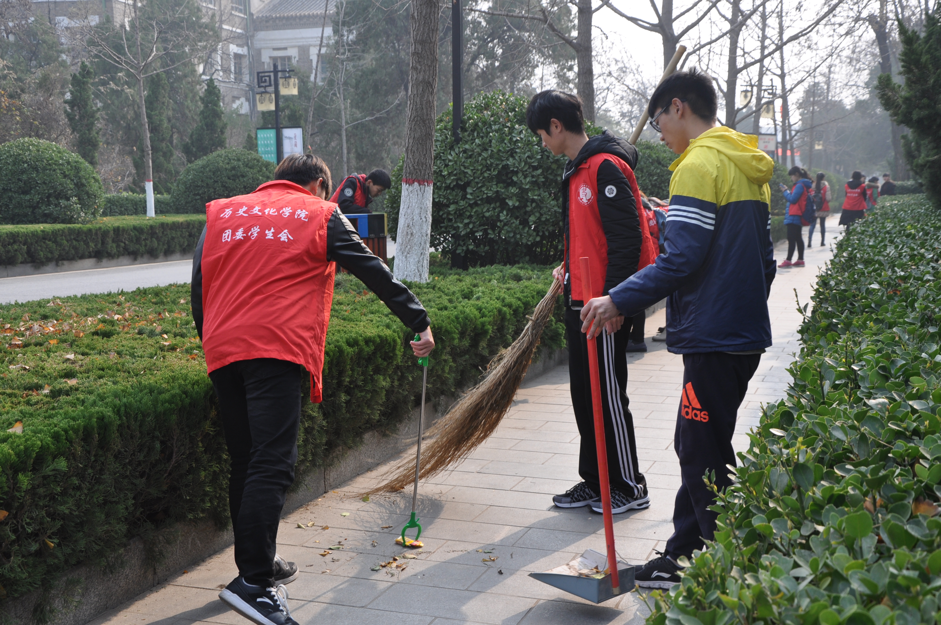 七号楼内外卫生。在活动过程中,青年志愿者们手持塑料袋、笤帚等清扫工具,沿途弯腰认真地清扫各个角落。他们认真负责,积极参与各个区域的清扫活动:将道路上的树叶、垃圾一一捡拾起来,将路旁电线杆上的小广告用铲子仔细铲除,认真打扫学院办公楼。尽管时间紧迫、任务艰巨,志愿者们仍耐心细致地完成各自的任务。在志愿者们不懈的努力下,经过两个小时的奋斗,学校南门内外与博雅楼卫生情况得到大幅度提高。