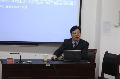 王瑞来研究员通过政治视野对皇权进行考察,将“天、道、法”形象比喻成皇帝头上的三个“紧箍咒”,此外,皇帝面前还有三堵墙:“不文的习惯法”、“共议:即有话语权的士大夫声音的舆论”、“留名的青史”来向大家形象地介绍相互制约的君臣关系。他还通过图示皇权的方式展示了皇权与相权、皇帝与臣民的关系,他认为图示皇权拥有拱桥形与金字塔形两种,且拱桥形更能够形象的展示皇权的地位与存在形式。最后,王瑞来研究员还提出了“中国为什么未成为君主立宪制国家?”、“在中国皇帝到底走了没有?”、“如何评价皇权走向象征化趋势?”等几条余论,并就自己的观点与现场师生进行了分享。