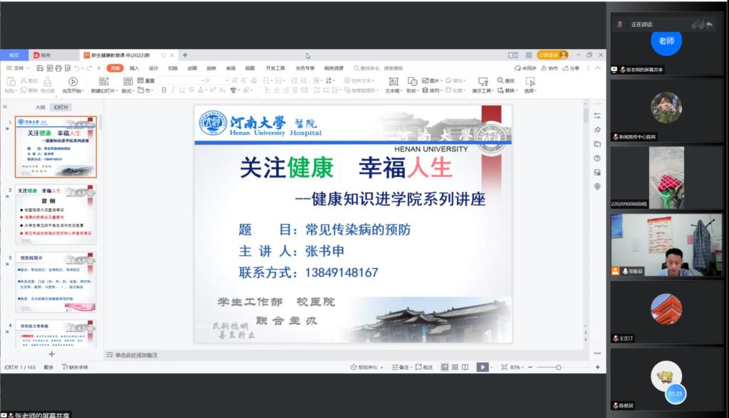 校医院的基本情况、主要职能以及大学生医保常识。接着,他讲到健康的新概念,并结合“1+0健康定律”说明了健康的重要性。他通过“全民健康生活方式日”的主题引出了“三减三健”的概念,倡导新生做到合理膳食、适量运动、戒烟戒酒及心理平衡。同时,他建议同学们积极参与各项有益的体育活动。随后,张书申列举了大学生常见的不良生活方式及其危害,提醒大家及时改善不良生活习惯。紧接着,他详细介绍了常见传染病及预防方法。在国内外新冠肺炎疫情形势严峻的背景下,他提醒同学们重视防控,严格遵守学校、学院疫情防控规定。最后,张书申向同学们科普了心肺复苏急救知识,并详细讲解了相关注意事项。