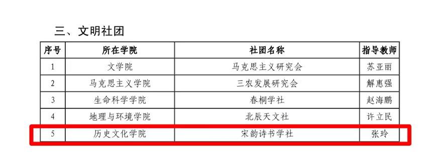 仁和公寓3号楼512宿舍被授予“文明宿舍”荣誉称号;宋韵诗书学社被授予“文明社团”荣誉称号;2020 级世界史专业徐沐阳被授予“文明学生”荣誉称号。