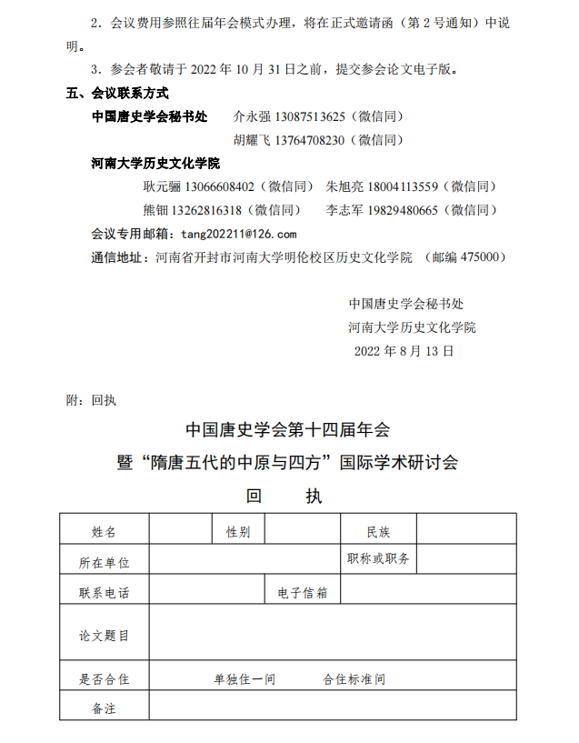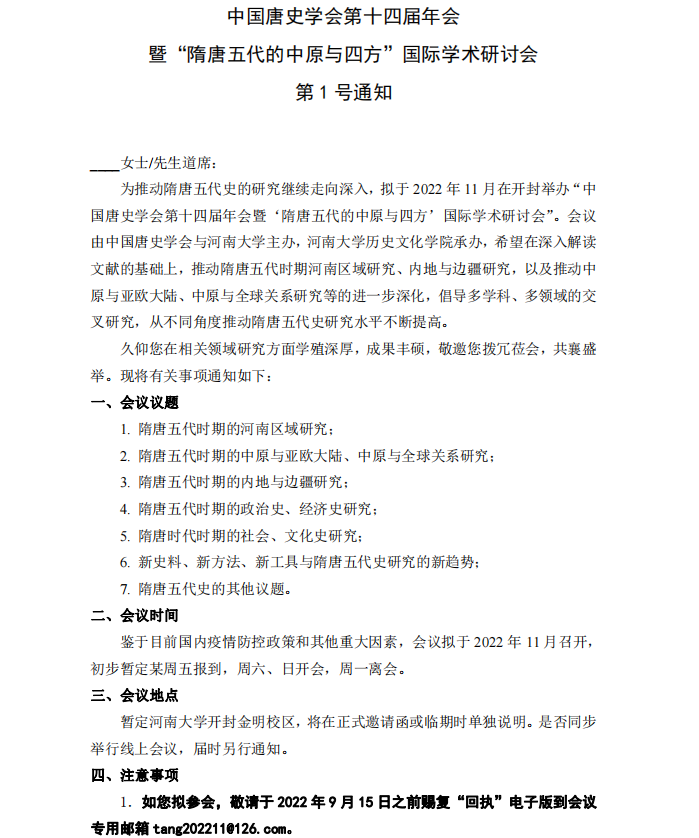 中国唐史学会第十四届年会 暨“隋唐五代的中原与四方”国际学术研讨会 第 1 号通知